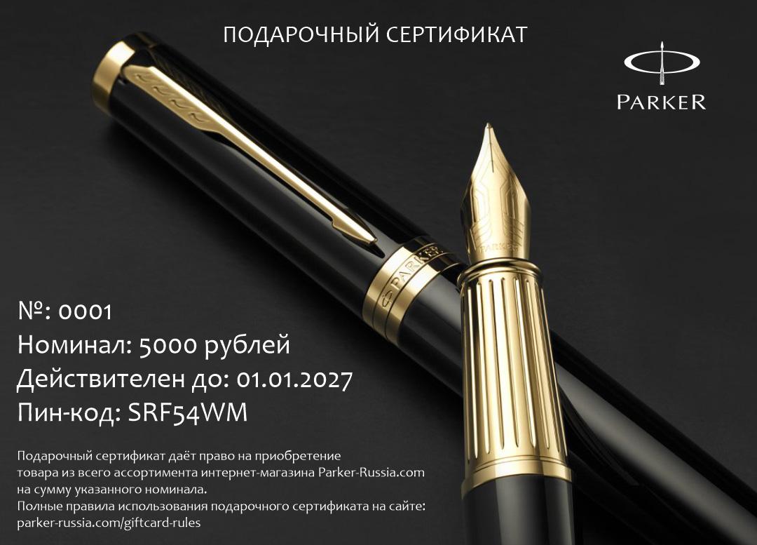 Подарочный сертификат Parker 15000 от официального дилера Parker в Ярославле. Вы можете дополнительно заказать гравировку, которая подчеркнет Вашу оригинальность и придаст памятность статусному подарку. Все ручки Паркер поставляются в фирменном футляре.